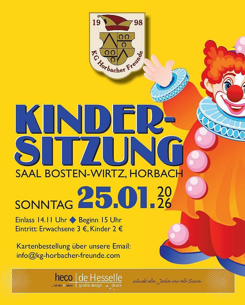 Hallo und Herzlich WillkommenKG Horbacher Freunde Kontakt Wir präsentieren:Friends of Fantasy Mehr erfahren Wir präsentieren:unsere Jugendabteilung Mehr erfahren Wir präsentieren:Men of Fantasy Mehr erfahren Aktuelle NEWS !!!Ab sofort kann für unsere Veranstaltungen Karten gekauft werden!!! Kindersitzung ist ausverkauft!!!! Es sind noch Karten für die Damensitzung da !!! Unsere Sitzungstermine 2025/26: 25.01.2026 Kindersitzung30.01.2026 Damensitzung01.02.2026 Herrensitzung14.02.2026 Kostümball Die Vorbestellungen zu unseren Sitzungen in 2025/26 sind gestartet Reservierungen gerne über unsere Seite Kartenbestellung oder den bekannten Anlaufstellen Ehrenmariechen Lara Jakobi Kneipenkarneval 2025 Sponsoren